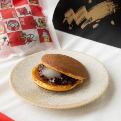ふんわり焼き上げた生地の中に、柔らかい求肥と特製粒あんを挟んだどら焼き。
