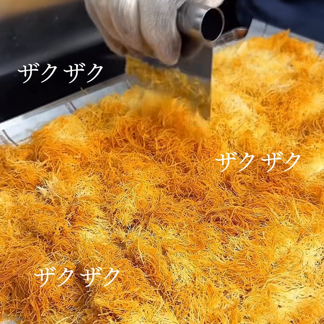 中側は、中東発祥の細い糸状パイ生地『カダイフ』を